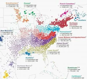 People moved east to west, less so north to south. See how the differently colored clusters form distinct horizontal bands? The red, blue, purple, and green dots fan out from right to left. This pattern means DNA confirms the descendants of immigrants to the East Coast moved westward.